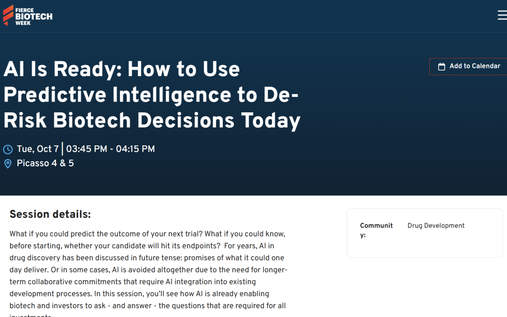 Tyrone Lam, Chief Business Officer for GATC Health, will officially announce the Derisq report at the Fierce Biotech Week in Boston during his panel on Tuesday, October 7, at 3:45 PM. The panel, titled “AI Is Ready: How to Use Predictive Intelligence to De-Risk Biotech Decisions Today,” will highlight the transformative power of AI in biotech decision-making.